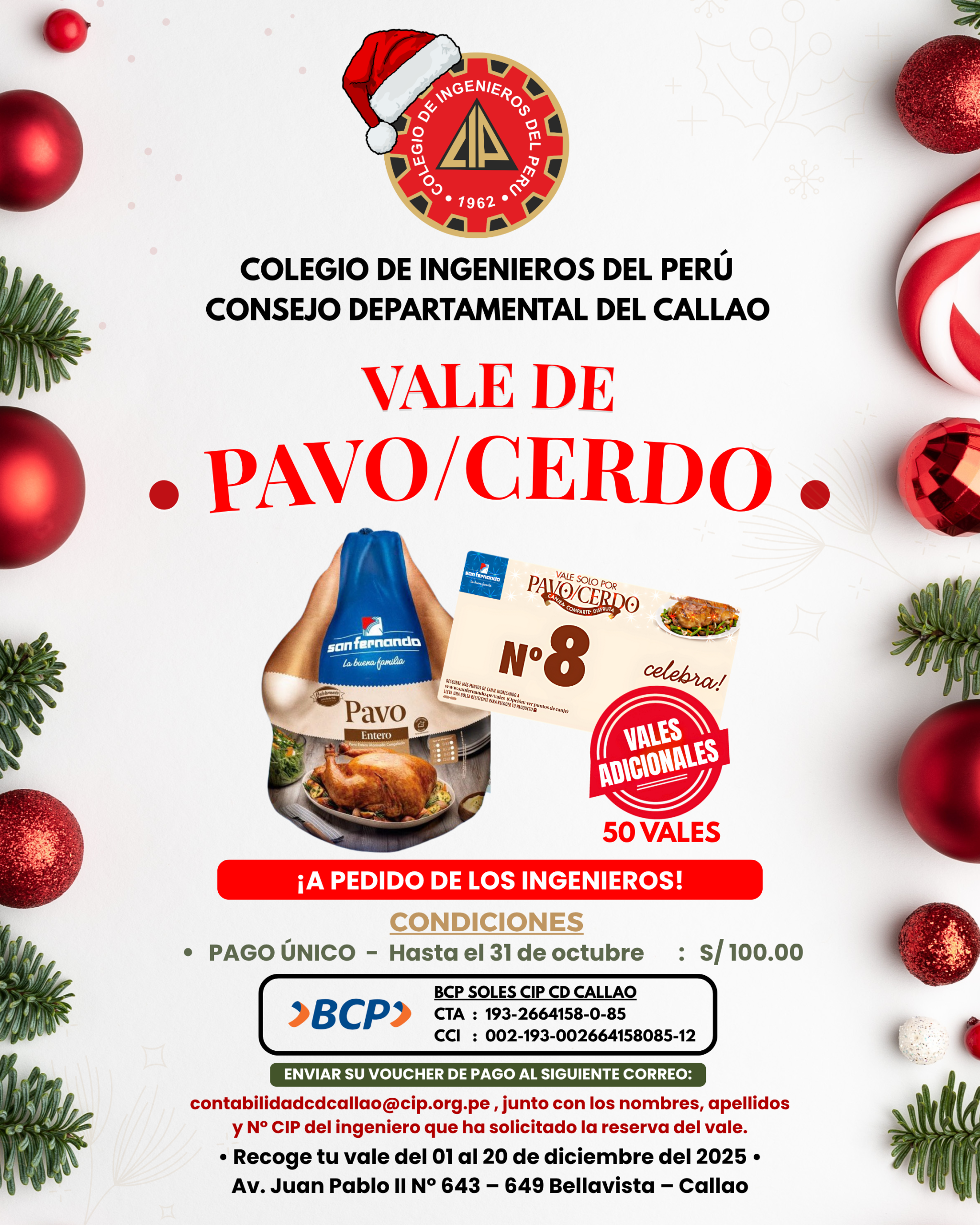 Debido a la gran demanda y a solicitud de nuestros agremiados, el CIP CD Callao ha extendido e incrementado 50 vales Nยฐ8 adicionales de PAVO/CERDO ๐ฆ๐