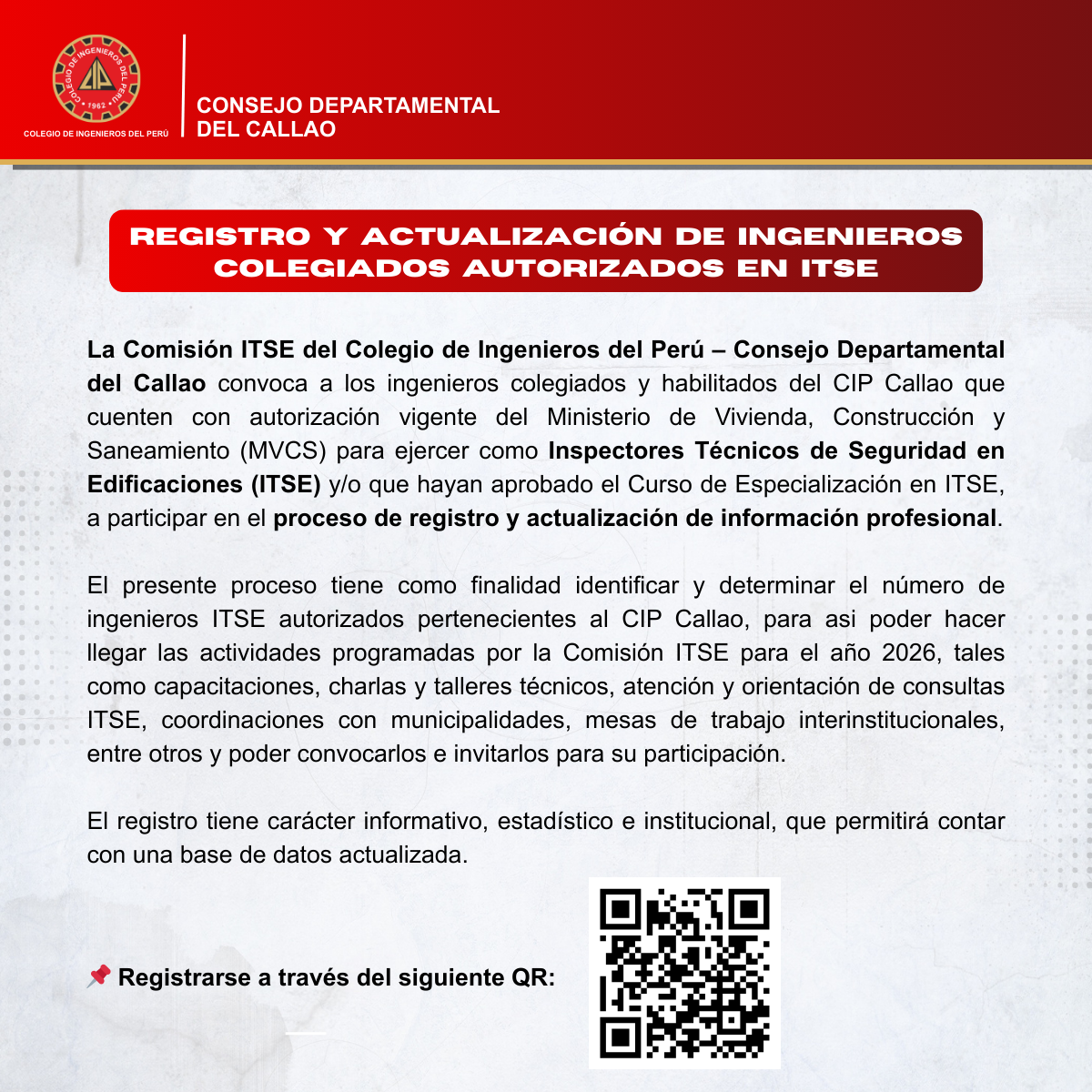 El Colegio de Ingenieros del Perú – Consejo Departamental del Callao invita a todos sus agremiados que cuenten con autorización vigente del Ministerio de Vivienda, Construcción y Saneamiento (MVCS) para ejercer como Inspectores Técnicos de Seguridad en Edificaciones (ITSE), a realizar su registro y/o actualización de […]
