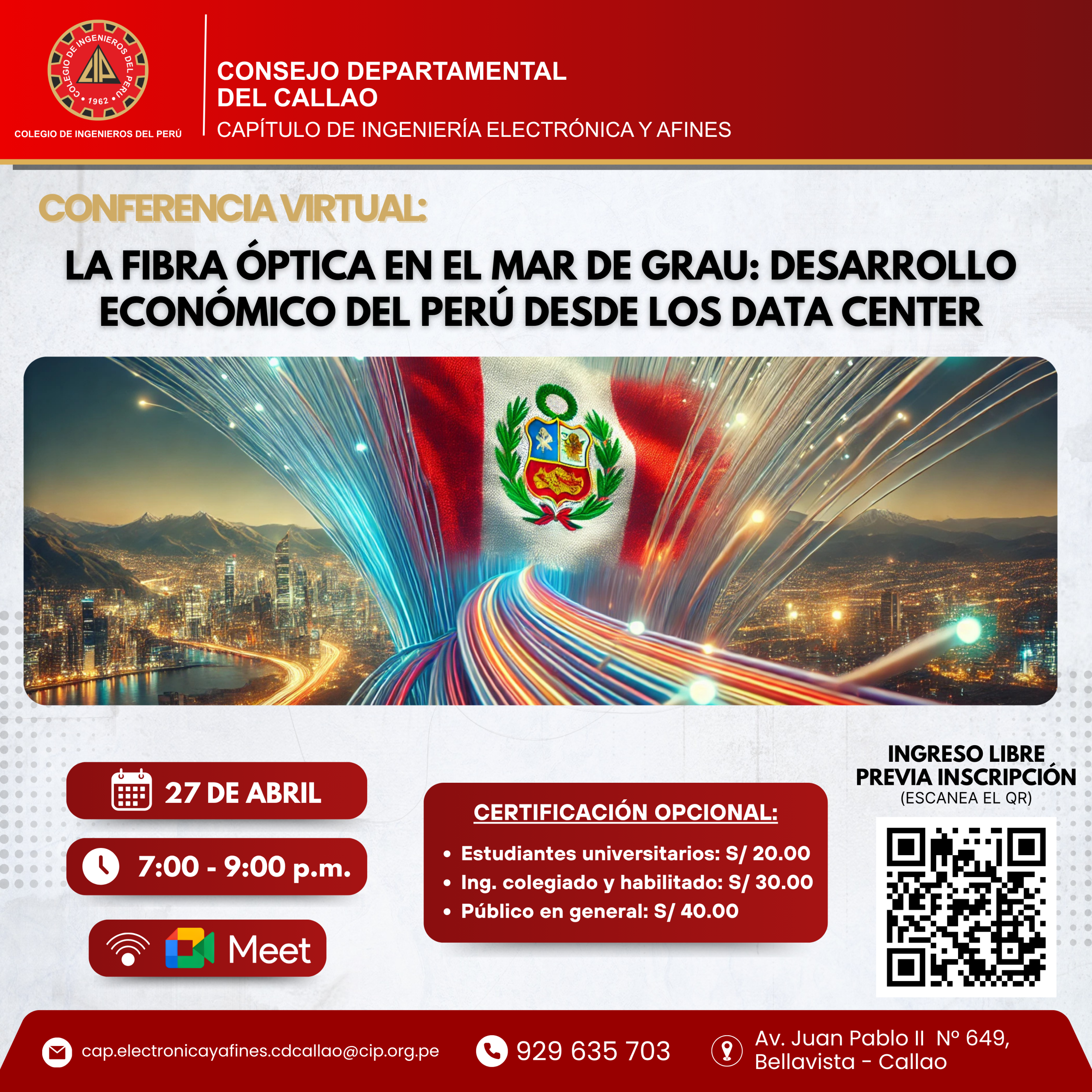 📅 𝗙𝗲𝗰𝗵𝗮: Lunes 27 de abril ⏰ 𝗛𝗼𝗿𝗮: 07:00 p.m. – 09:00 p.m. 💻 𝗠𝗼𝗱𝗮𝗹𝗶𝗱𝗮𝗱: Virtual – Meet 🎟 𝗜𝗻𝗴𝗿𝗲𝘀𝗼 𝗹𝗶𝗯𝗿𝗲 (𝗰𝗼𝗻 𝗽𝗿𝗲𝘃𝗶𝗮 𝗶𝗻𝘀𝗰𝗿𝗶𝗽𝗰𝗶𝗼́𝗻): https://forms.gle/j7DvoCiAX7ApyBcu8 🎥 𝗔𝗰𝗰𝗲𝘀𝗼 𝗮 𝗠𝗲𝗲𝘁: 👉 https://meet.google.com/ajy-cyzz-afj 📜𝗖𝗲𝗿𝘁𝗶𝗳𝗶𝗰𝗮𝗰𝗶𝗼́𝗻 𝗼𝗽𝗰𝗶𝗼𝗻𝗮𝗹: Estudiante universitario: S/ 20.00 Ing. colegiado y habilitado: S/ 30.00 Público en general: […]